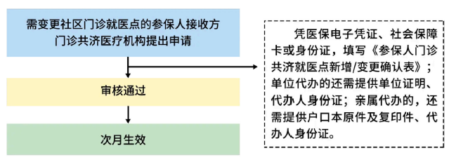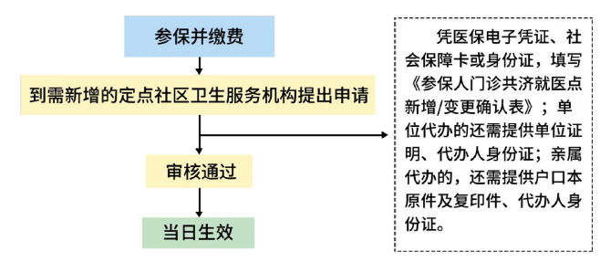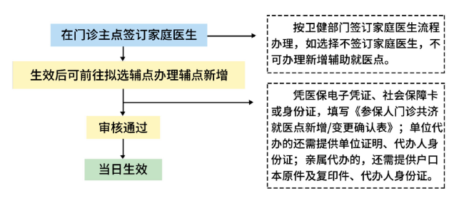 实行“一人一主点一辅点”选点规定东莞市参保人可在参保地辖区内,选定一家定点社区卫生服务机构作为门诊主就医点(即主点),例如:学生选择东莞校区医务室就诊,则需要选择主点为“广州新华学院东莞校区门诊部”。在门诊主就医点签订家庭医生服务协议后,可在市内选定一家定点社区卫生服务机构或定点医院作为门诊辅助就医点(即辅点)。门诊共济定点医疗机构选定手续当月办理,当月生效。
