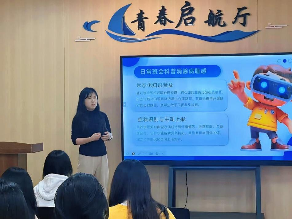 经济与贸易学院张茜若老师则以“从日常追踪到协同育人”为主线,分享了她的“联结”之道。她强调,每周追踪不是机械打卡,而是基于情感联结的持续陪伴,通过日常闲谈、真诚关心,让学生卸下防御、主动表达。在心理排查方面,她构建了四级工作网络:从宿舍长的“传感器”作用,到心理委员的系统培训(涵盖倾听、共情、危机信号判断),再到辅导员与心理中心的联动,层层织密支持网。她还展示了丰富多样的心理班会与活动设计——以热点话题切入、融入心理团辅游戏,让学生在体验中反思成长;同时,通过“种子卡片”“心理游园会”等温暖小活动,将成长希望悄然植入学生心中。